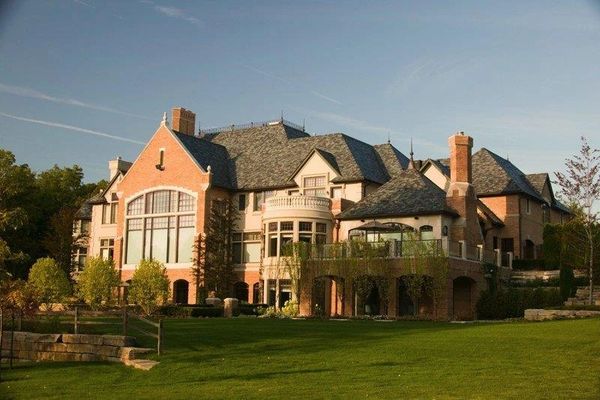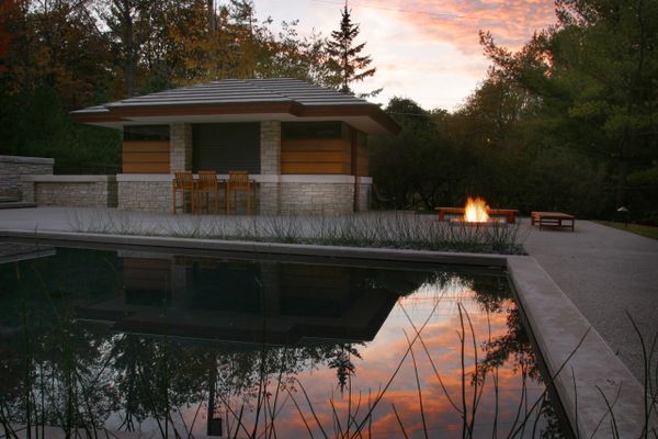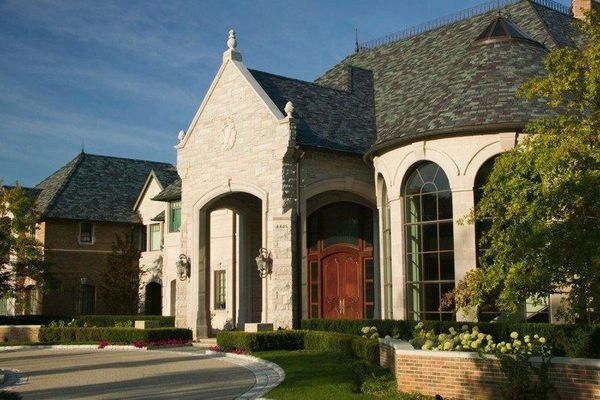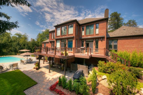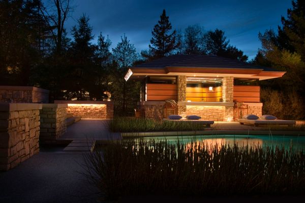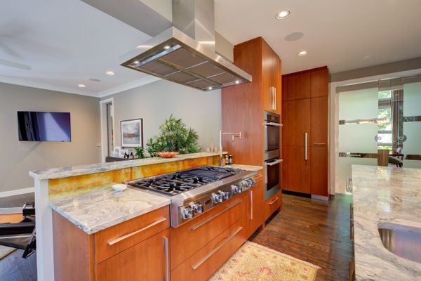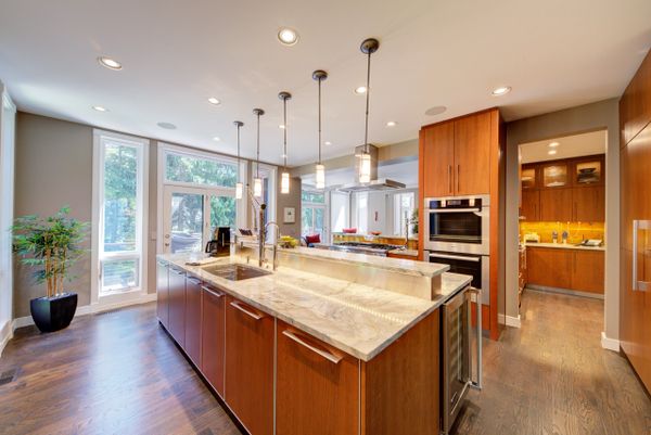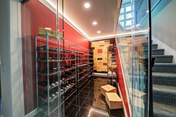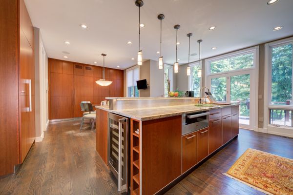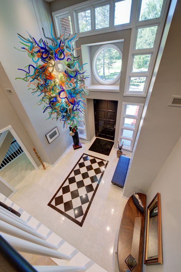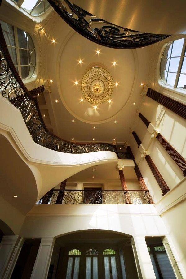 Stone pillars, waxed hardwood and glass railings are just a few of the modern materials used in this home.